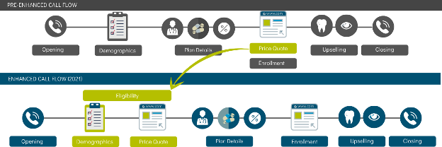 The chart below shows the adjustments made to the call flow. The point at which an associate would provide a quote, for example, was moved up to the eligibility stage.